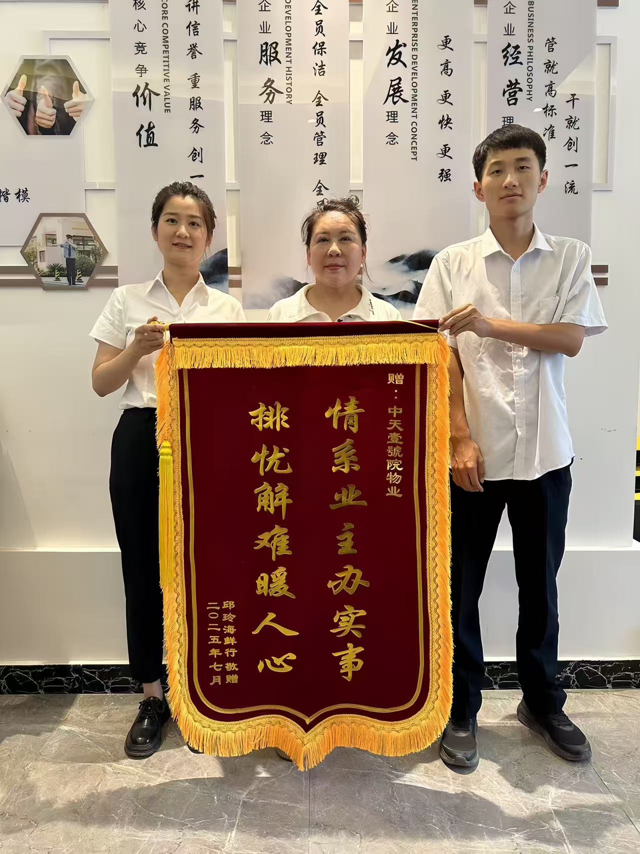 在中天·壹號(hào)院這片溫馨的家園里,中天物業(yè)用一次次暖心的服務(wù),贏得了業(yè)主們的真心贊譽(yù)。一面面錦旗,宛如璀璨的星光,照亮了物業(yè)與業(yè)主之間深厚情誼的天空,講述著那些令人感動(dòng)的故事。接下來中天物業(yè)也將繼續(xù)保持良好的工作態(tài)度,用心服務(wù)業(yè)主,用細(xì)節(jié)品質(zhì)打動(dòng)業(yè)主,讓您真切感受到中天物業(yè)人的每一份溫暖問候和關(guān)懷!
